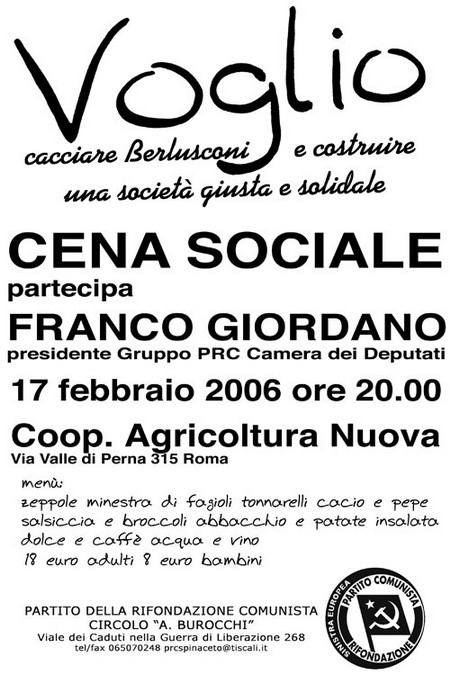 Cena sociale circolo prc spinaceto venerdi 17 febbraio