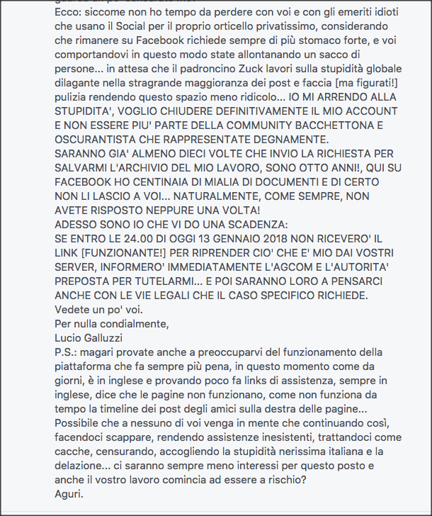 N.B.: dopo 11 richieste, senza risposta, per ottenere il mio archivio, finalmente, minacciati di far intervenire l’AGCOM, ieri mi hanno "permesso" di salvami le mie pubblicazioni.