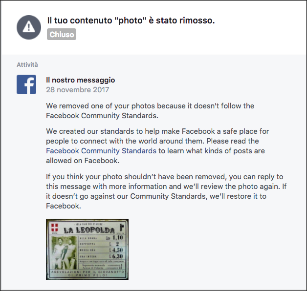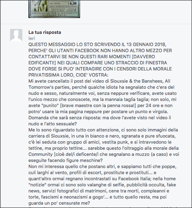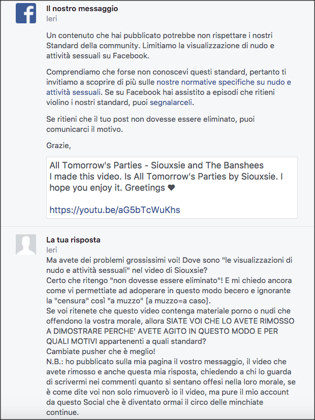 Intanto lo Staff/Centro Assistenza mi rimuove un video di Siouxsie and the Banshees [All Tomorrow’s Parties] perché "ho violato le regole" postando nudo, atti sessuali e non si capisce bene cosa e mi hanno sospeso per 24 ore dalla pubblicazione di qualsiasi contenuto sulla mia pagina...