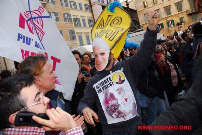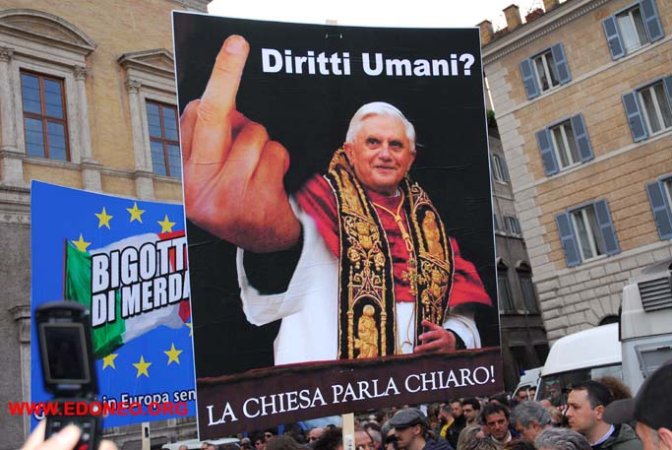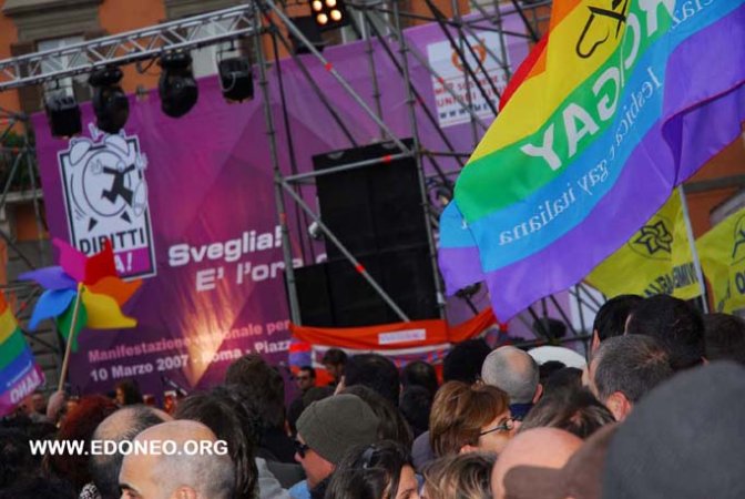 È un popolo coloratissimo quello di piazza Farnese. Decine di bandiere arcobaleno con il simbolo dell’Arcigay sventolano nella piazza. Ci sono anche le bandiere dei Radicali, dei Ds, dei Giovani Socialisti, dell’unione degli atei e degli agnostici razionalisti oltre a quelle della Sinistra giovanile. Tanti anche gli striscioni tra cui quello che si riferisce proprio all’esecutivo e al destino dei Dico: «Il Governo lancia il sasso e poi nasconde la mano» e, ancora, alcuni ragazzi indossano, per parodia, gli abiti talari ed il cappello vescovile con sopra scritto «Meglio gay che Opus Dei». Immancabile lo sguardo oltre confine con l’esaltazione della Spagna dei diritti: «Zapatero tanto subito» recita un cartello.