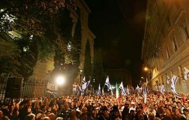 Ma soprattutto sono presenti molti giovani arabi, libanesi e palestinesi, che rispondono a tono agli ebrei romani: «Assassini, assassini». Il sentimento dominante nella piazza è l’odio. Due popoli, due Stati: macché, solo a parole. Manuela Palermi, dei Comunisti italiani, tenta di far presente agli ebrei che i pacifisti italiani hanno già cacciato dai loro cortei i facinorosi che bruciarono le bandiere. Ma dall’altra parte le rispondono che «Diliberto ha stretto la mano a Nasrallah ». Un cordone di polizia con i caschi e i manganelli fa in tempo a mettersi in mezzo per dividere le due fazioni. Intanto, però, scoppia pure un bombone da stadio e non si capisce chi sia stato a farlo esplodere: gli ebrei, i palestinesi o i tassisti che ce l’hanno con Bersani. Poi, finalmente, la fiaccolata punta verso il Colosseo e gli ebrei si ritirano. E dove vanno? Alle 22 molti di loro li ritrovi davanti alla Sinagoga, dove c’è tantissima gente, più di mille persone, anche gli ex deportati, i sopravvissuti di Auschwitz, con la kippah e le bandiere al collo.