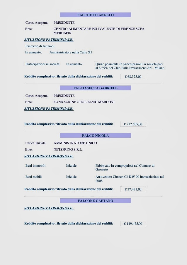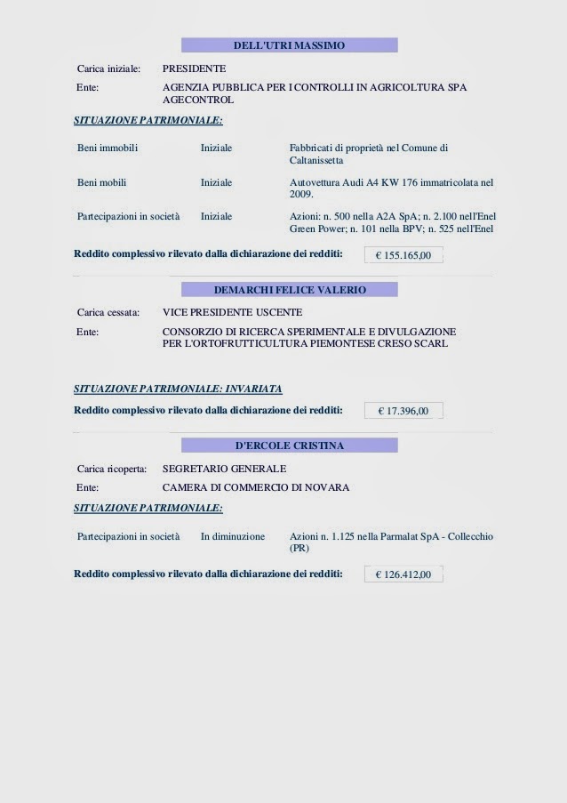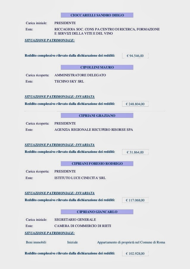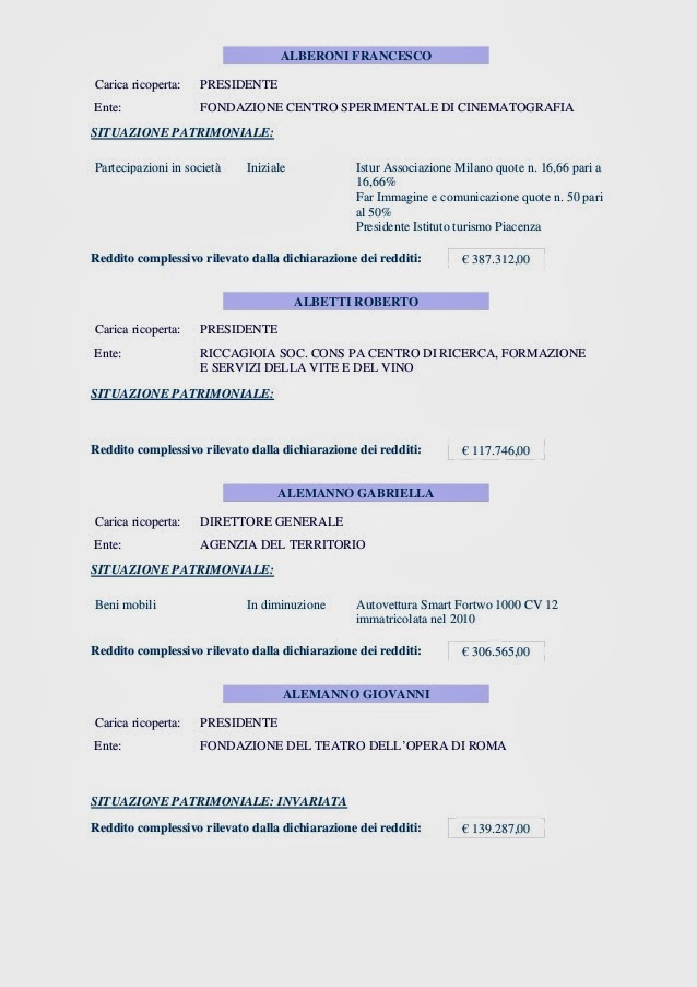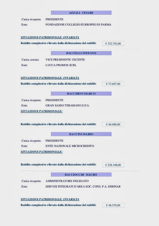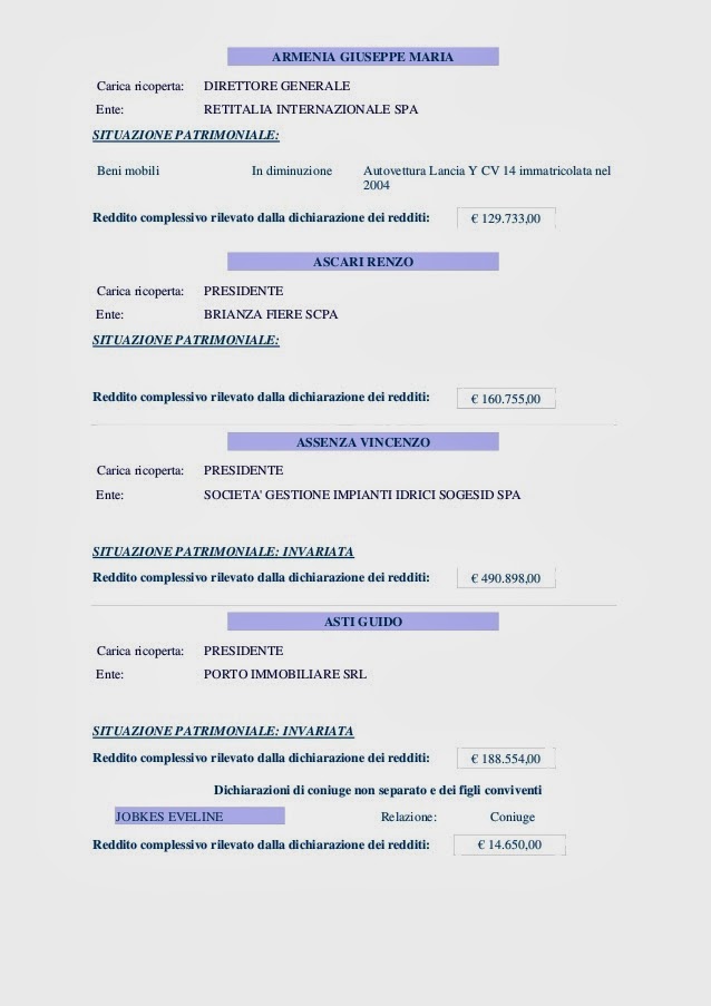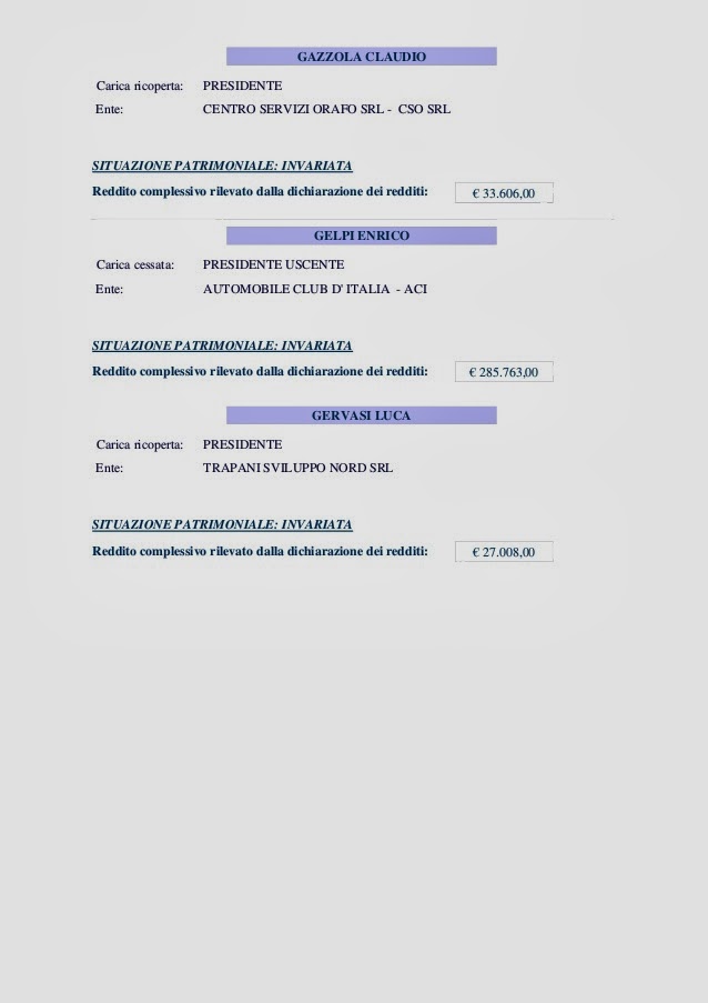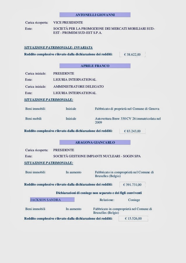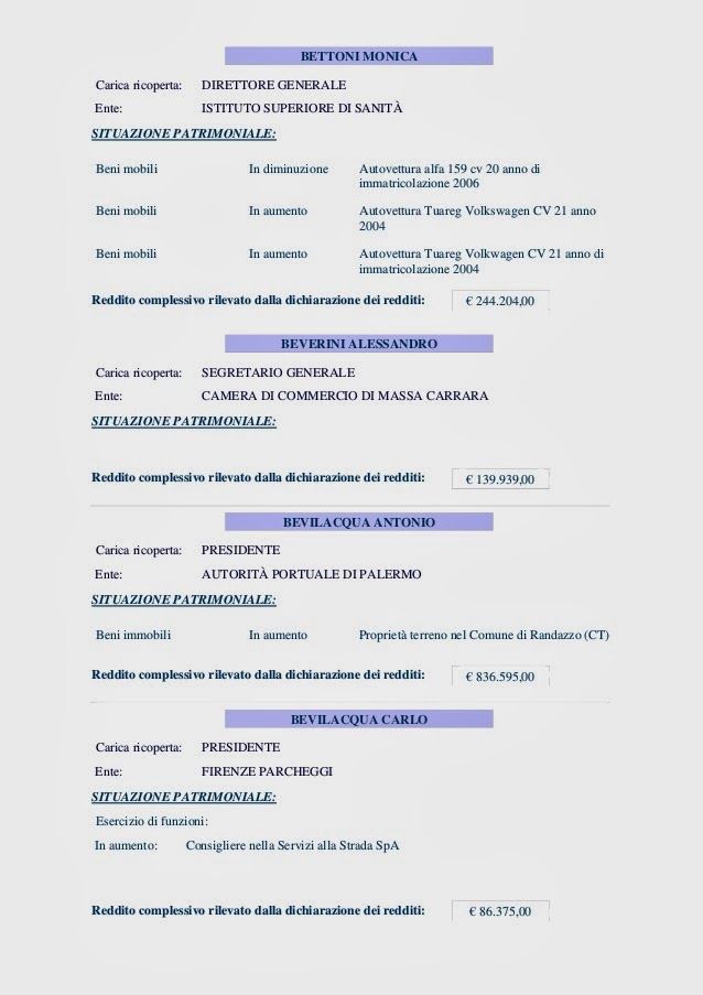 E’ UN DOVERE, ALLORA, FORNINE ALLA RETE TALE DOCUMENTAZIONE, IN MODO CHE CHIUNQUE LA POSSA CONSULTARE, FOGLIO PER FOGLIO, NOME PER NOME, CON INCARICHI, POLTRONE OCCUPATE, NOMINE VARIE, PATRIMONIO IMMOBILIARE E ACCESSORI E REDDITO TOTALE PER L’ANNO ANALIZZATO.