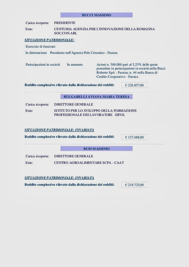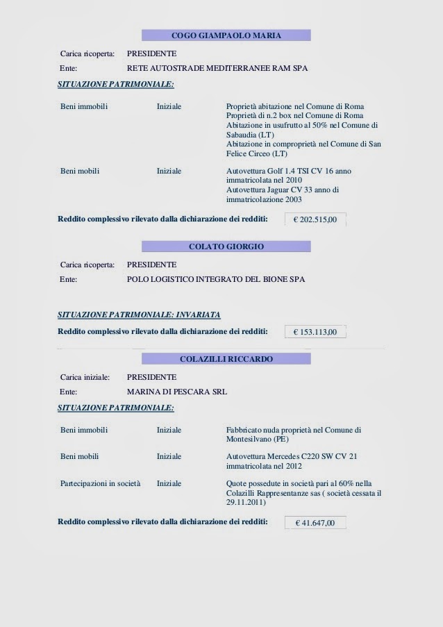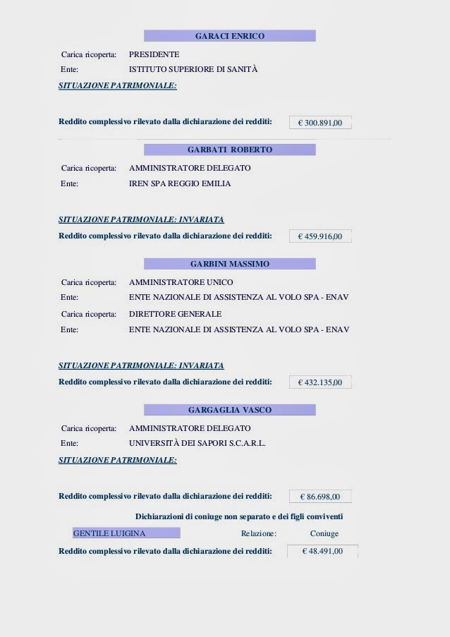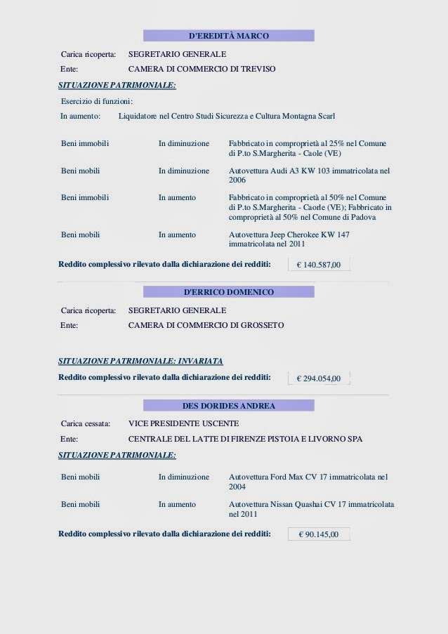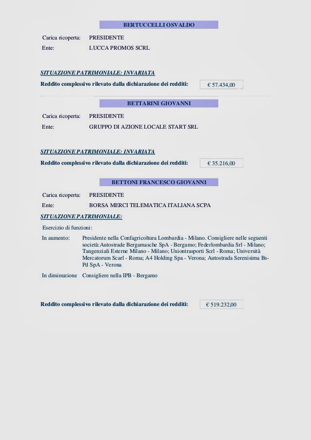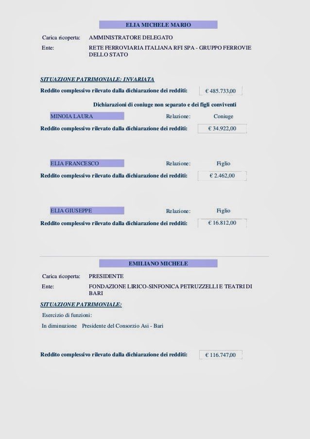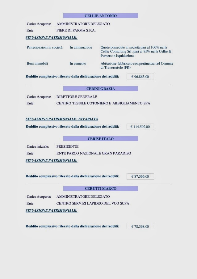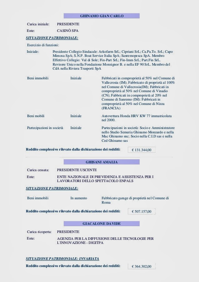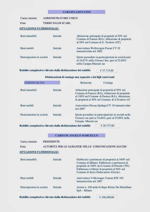 E’ UN DOVERE, ALLORA, FORNINE ALLA RETE TALE DOCUMENTAZIONE, IN MODO CHE CHIUNQUE LA POSSA CONSULTARE, FOGLIO PER FOGLIO, NOME PER NOME, CON INCARICHI, POLTRONE OCCUPATE, NOMINE VARIE, PATRIMONIO IMMOBILIARE E ACCESSORI E REDDITO TOTALE PER L’ANNO ANALIZZATO.