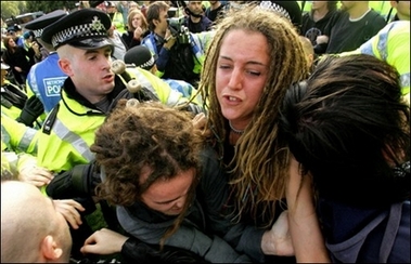 A protester is restrained by a policeman during a demonstration in Parliament Square, London October 9, 2006. The protest was timed to disrupt members of parliament as they returned to their Parliamentary offices for the first working day after the summer recess. REUTERS/Eddie Keogh (BRITAIN)