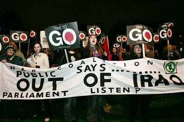 Hundreds of anti war protesters demonstrate outside Houses of Parliament in London, Tuesday, Oct. 31, 2006. Prime Minister Tony Blair faced a new challenge to his authority Tuesday as lawmakers debated the role of coalition troops in Iraq for the first time since the 2003 U.S.-led invasion and planned to vote on a proposal for an immediate inquiry into Britain’s role in the conflict. (AP Photo/Sang Tan)