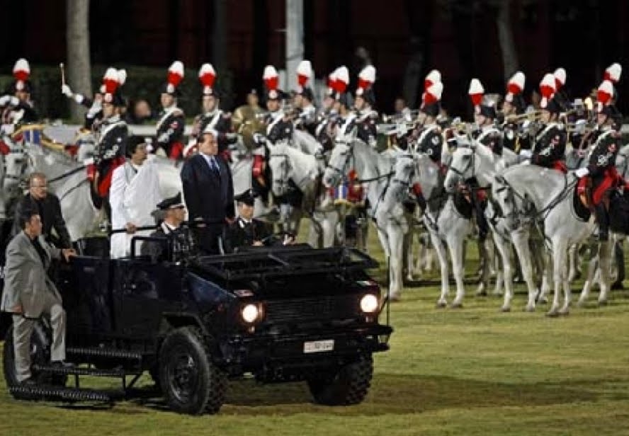 Quel criminale, terrorista, pazzo furioso, assassino di Gheddafi viene in Italia, e l’esecutivo lo accoglie in pompa magna, le ministre in orgasmo si sono fatte fotografare accanto a lui, la borghesia e i cialtroni nobili nazionali erano tutti lì, mostravano le toilettes da sera talmente cafone, le toilettes, dai farli sembrare letteralmente dei cessi.