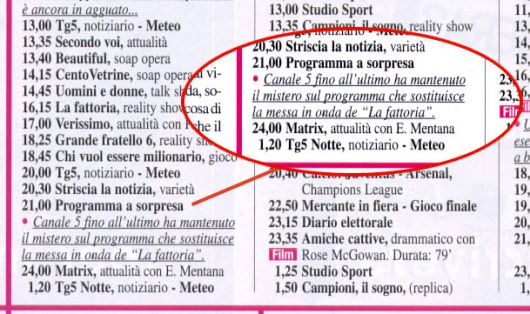 Berlusconi getta i media nel panico annunciando, a sorpresa, un suo intervento a Canale5 nella serata di ieri. Ma forse non di sorpresa si trattava, perché il settimanale DiPiùTv, Cairo editore, nel numero uscito lunedì scorso anticipava la sostituzione della Fattoria con una trasmissione misteriosa. La segnalazione arriva da una lettrice di Repubblica.it