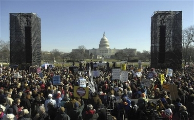 With the Capitol as a backdrop, demonstrators listen to the speakers during a protest against the war in Iraq on the National Mall on Saturday, Jan. 27, 2007, in Washington.