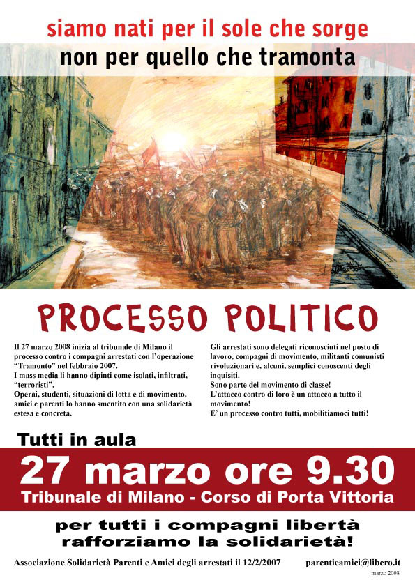 Publie le lunedì 24 marzo 2008 par Open-PublishingIl processo contro i compagni arrestati il 12 febbraio 2007 è un PROCESSO POLITICO perchè vuole annichilire ogni idea di cambiamento rivoluzionario della società di barbarie e morte che il capitalismo ha prodotto.