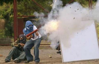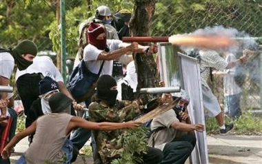 University students fire homemade mortars at riot police during a protest against a fare increase for public transportation in front of the Central American University (UCA) in Managua, Nicaragua, Thursday, June 8, 2006. (AP Photo/Esteban Felix)