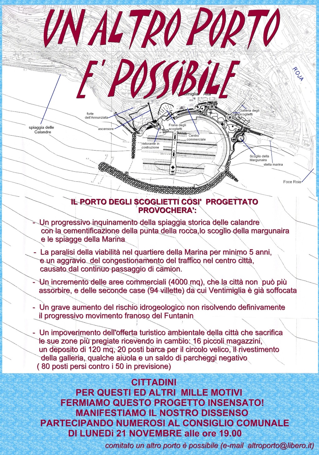 Ho visto in questi giorni il progetto del porto della nostra sofferente città. Dico sofferente perchè chiunque viva a Ventimiglia sa che ormai da più di 30 anni la nostra città è in uno stato comatoso quasi irreversibile le colpe troppo facile darle agli amministratori di destra o sinistra le colpe sono dei 27-28000 ventimigliesi che piano piano hanno ridotto la città ad un dormitorio lo stato di abbandono di Ventimiglia alta è forse soltanto colpa del sindaco (Valfrè o Berlingiero o Ballestra, Pastor) o anche degli abitanti che mantengono le cose in questo stato parla una persona che nel centro storico molto spesso va a comperare lle focacce la notte e che ogni volta pensa che posto magnifico sarebbe se fosse come non dico PORTOFINO O Genova basterebbe guardare come a Dolceacqua gli abitanti tengano il borgo antico. Ma parliamo del porto secondo me un comitato che vigili come UN ALTRO PORTO è POSSIBILE è giusto che esista e che controlli mi viene da domandarmi perchè però questo comitato sia venuto fuori solamente a due passi dalla conclusione della pratica di presentazione del porto in consiglio comunale visto che il sito degli scoglietti è stato scelto dalla regione dieci se non più anni fa (scelta per me poco ragionevole ma si sa a nervia ci sono le paperelle) é mi chiedo anche se detto comitato non avrà poi vita breve appena i suoi simpatizzanti non si renderanno conto che i lavori di costruzione del suddetto porto porteranno del denaro a Ventimiglia (unico motore di questa città dove per spillare quattrini vi sono bar mi pare 127 o piu,bottiglierie ed ora il bengodi dei tabacchi,) Le calandre bellissima spiaggia di 3 metri di larghezza per 200 di lunghezza andatE voi a meta agosto a stendere un asciugamano c’è la sabbia e poi? sentiero che per quanto rimesso a posto è inaccessibile da persone con Handicap, si la spiaggia è lontana dal centro si sta tranquilli ma la gente secondo voi sceglie Ventimiglia per le Calandre o preferirà sceglierla per la presenza di un porto funzionale con attivita svago ecc (non deve essere per forza agli scoglietti ) QUELLO CHE CHIEDO AL COMITATO ED AGLI OPPOSITORI DEL PORTO è DI PRESENTARE UN PROGETTO ALTERNATIVO DI PORTO PROPRIO COME DICE IL VOSTRO NOME UNALTRO PORTO è POSSIBILE BENE DITEMI DOVE ? (RISPETTANDO I VINCOLI ASSURDI DELLA REGIONE ) GRAZIE R.M