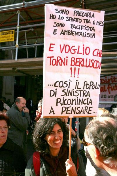 Rappresentazione iconica abbastanza fedele di come la penso anch’io, anche se l’espressione "popolo di sinistra" andrebbe rivista, perché è diventata qualcosa di insopportabilmente retorico.. Anche Fassino è uso dire "la nostra gente, i nostri valori", e intende "il popolo di sinistra".