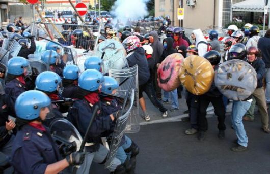 Guidati da Luca Casarini, i disobbedienti, caschi da moto e aste di bandiera, hanno improvvisamente sfoderato una "testuggine" metallica decisi a sfondare la "zona rossa" e a raggiungere il muro. Immediata la replica delle forze dell’ordine che hanno caricato con decisione alternando le manganellate al lancio di lacrimogeni, mentre dal comando dell’Arma si alzava in volo un elicottero. Tra i due fronti il contatto è stato breve ma violento: i No Global hanno risposto alla carica esplodendo petardi e bengala contro gli agenti, quindi - dopo un corpo a corpo che ha costretto alle cure ospedaliere due celerini e quattro ragazzi - sono ripiegati verso l’incrocio stradale della Stanga, il più trafficato di Padova, dove la circolazione è rimasta completamente bloccata fino a notte.