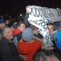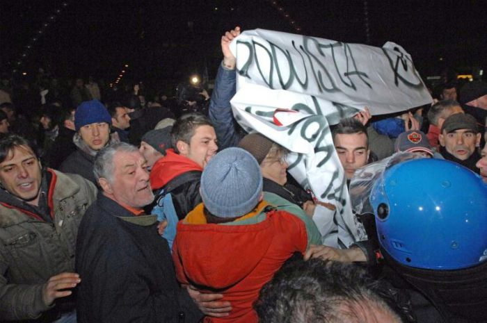 Uno striscione con la scritta "buffone", in inchiostro rosso era esposto proprio al centro di uno dei palazzi sul lato corto del colonnato, illuminato con due riflettori. Berlusconi non ha cambiato programma, è salito sul palco, ha cominciato il suo discorso alzando la voce via via che si facevano più forti gli slogan dei contestatori. Slogan duri come "Mafioso vattene", insulti assortiti e anche il lancio di un uovo che ha colpito di striscio il leader di Forza Italia, salvato stavolta da un suo sostenitore che ha raccontato poi di aver parato l’uovo con la mano.