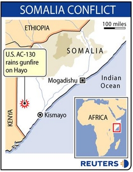 A U.S. warplane hunting al Qaeda suspects killed many people in south Somalia as other air strikes also hit the remote region where fugitive Islamist fighters are hiding, officials said on Tuesday. In the first known direct U.S. military intervention in Somalia since a failed peacekeeping mission that ended in 1994, an AC-130 plane rained gunfire on the desolate village of Hayo late on Monday, a senior government official said. (Graphics/Reuters)