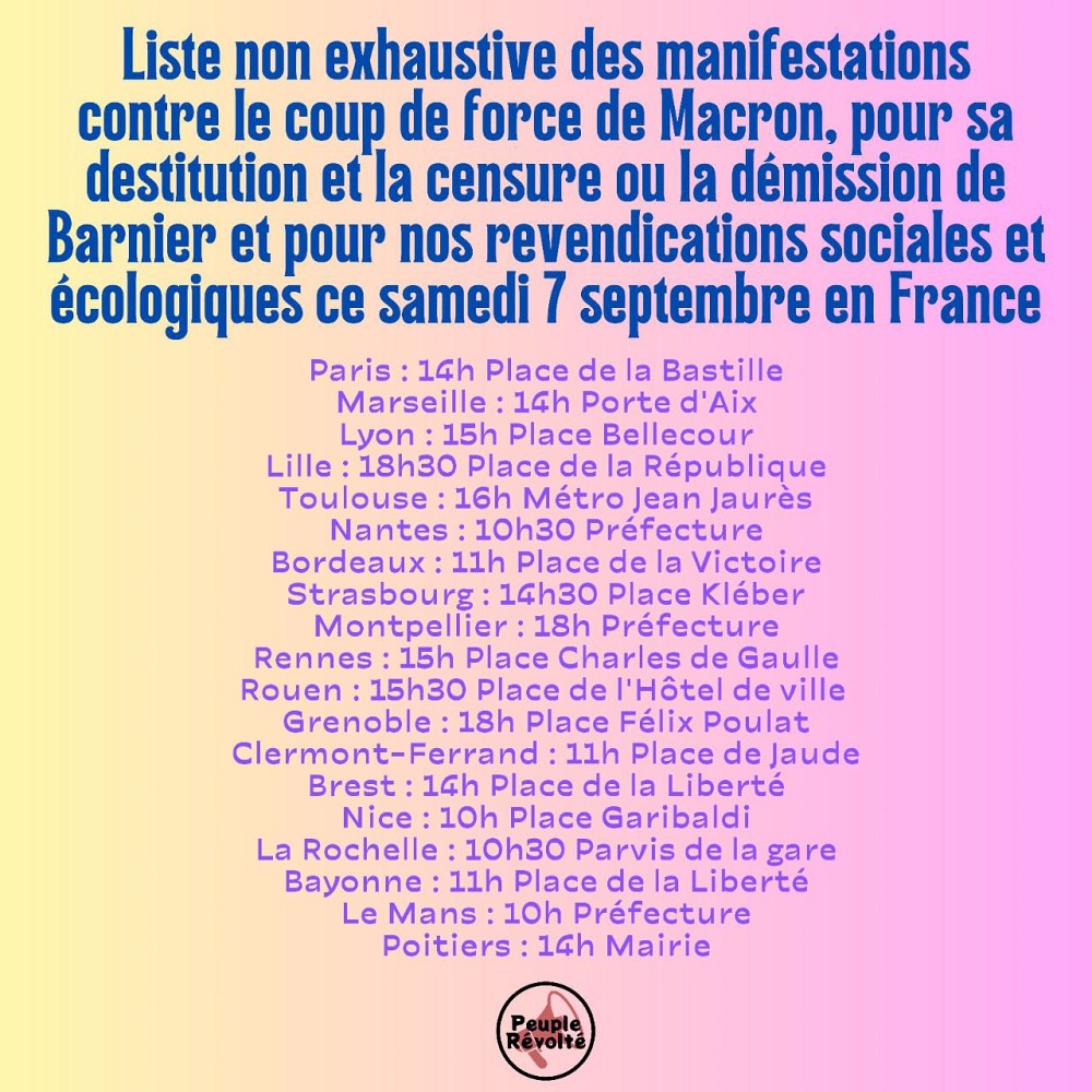 Liste non exhaustive des manifestations contre le coup de force de Macron, pour sa destitution et la censure ou la démission de Barnier et pour nos revendications sociales et écologiques ce samedi 7 septembre en France.