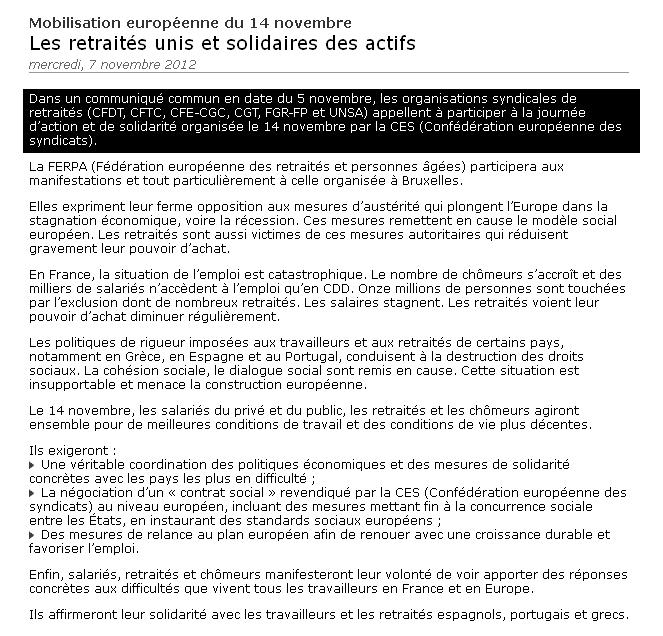 1. 14 novembre : Communiqué commun des Organisations syndicales de retraités, 8 novembre 2012, 21:40, par Joannès