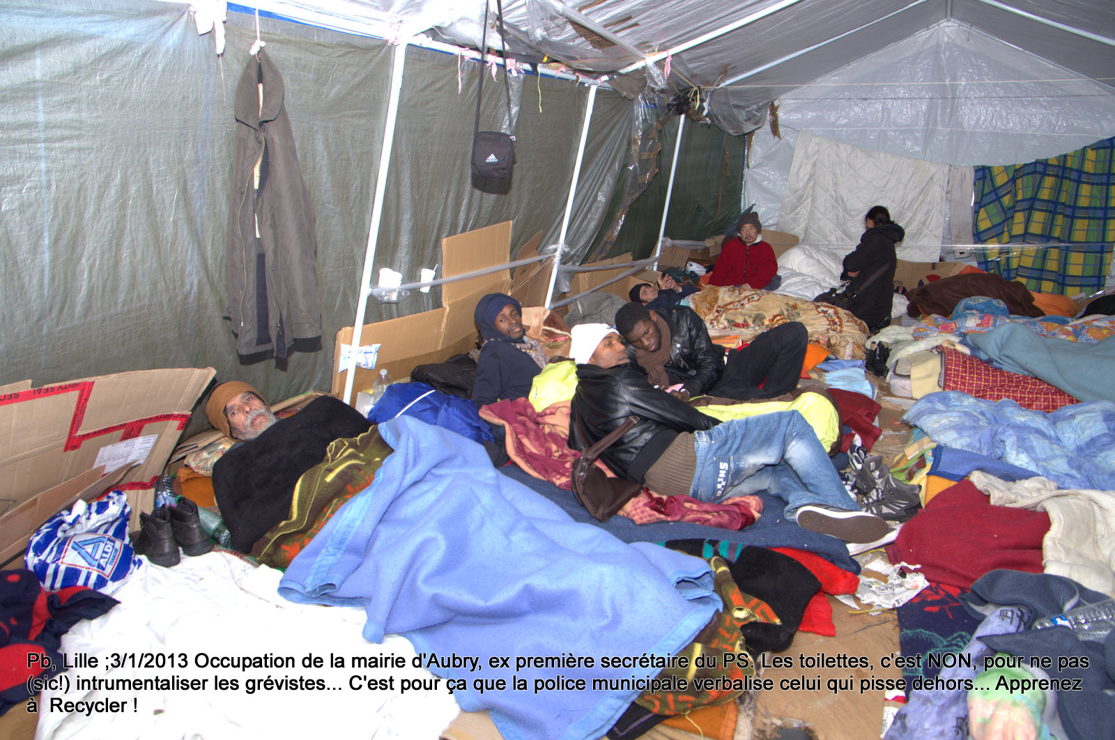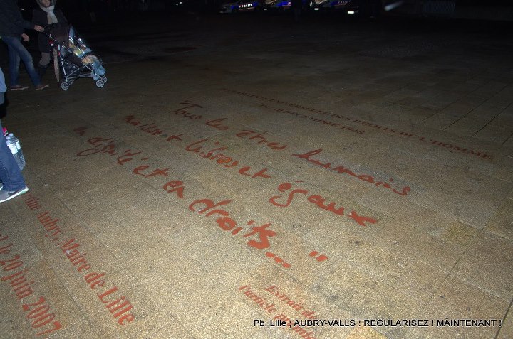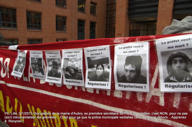 Aubry, en 2007, vous étiez dans l’opposition(sic !), et les Sans Pap’ étaient des hommes....Aubry, le 20 juin 2007, vous inauguriez le Parvis des Droits de l’Homme, face à la préfecture qui organisait la chasse aux sans papiers. Aubry, en 2012-2013, vous piétinez la dignité des grévistes sans papiers en les privant de toilettes !