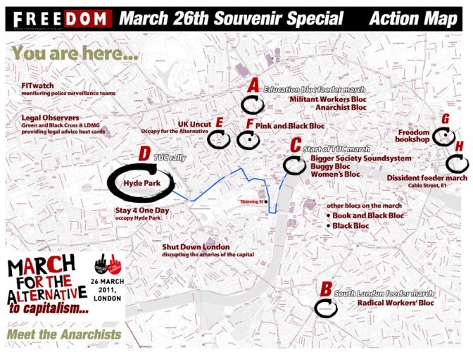 La colère s’étend. Alors que la Syrie connait ses premiers soulèvements en cette fin mars, les Londoniens sont appelés à la révolte samedi 26 mars. L’opposition et les syndicats ont appelé à une grande manifestation à Londres pour s’opposer aux mesures d’austérité imposées par le gouvernement Cameron. Appel qui a sans doute été jugé très insuffisant par un grand nombre d’organisations, notamment des groupes anarchistes ou autonome tel « Resist26″ qui ont décidé d’organiser près de 19 manifestations en simultanée ! Lesquelles seront parsemées de blocages, d’occupations et diverses autres actions coup de poing.