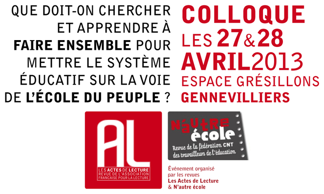 Pendant deux jours, les 27 et 28 avril 2013, il s’agirait de réfléchir à ces enjeux afin d’ouvrir des pistes effectives de recherche-action pour que l’école tienne son rôle transformateur dans le présent du fonctionnement social et cesse d’être l’outil qu’une société se donne pour produire les citoyens dont elle a besoin pour perpétuer son modèle.