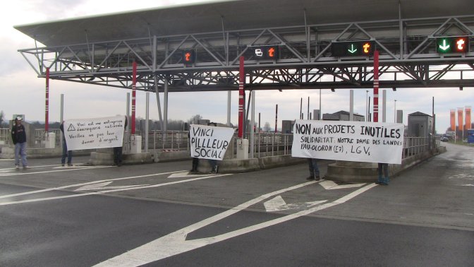 Samedi 19 janvier en début d’après-midi, une vingtaine de personnes se sont réunis autour du péage autoroutier de Vinci à Lescar (Béarn, près de Pau). Ils ont levé les barrières du péage, laissant passer les véhicules gratuitement. Des banderoles ont été brandies, avec pour message, dénoncer les intérêts de vinci et les politiques de grands projets inutiles, tel que l’aéroport de nantes, les LGVs(AHT, TAV), la pau-Oloron(E7)..... Cette action fait suite à l’appel de soutien de notre dames des landes.