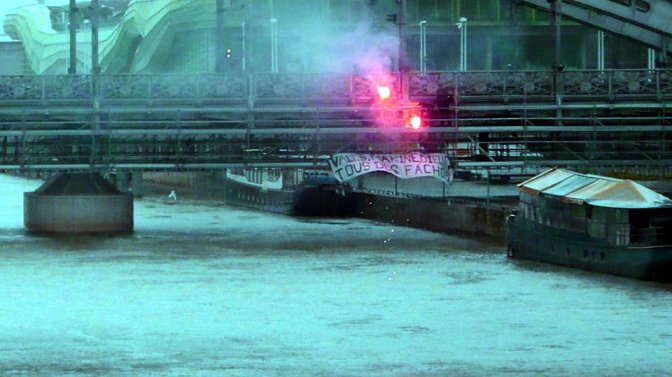 Néanmoins certaines organisations et individus nous ont prêté main forte. Nous avons donc dans un premier temps effectué un collage sur le parcours de la manifestation. L’affiche avec les visages de Dieudonné, Valls et marine Lepen accompagnés du texte « les nouveaux visages de la haine : racisme d état, islamophobie, antisémitisme » »combattons-les ». Cette opération s’est déroulée sans aucun problème. Elle nous a permis de montrer à l’extrême droite qu’il existe une présence antifasciste à Paris. Mais cela n’était pas suffisant. Pour que l antifascisme ne soit pas seulement un spectre, qui tapisse les rues de nuit, nous avons pris la décision de déployer une banderole visible pendant leur manifestation. Au moment où ils traversaient la Seine, nous avons avons déployé la banderole « Valls, Marine, Dieudo tous des fachos » et allumé pétards et fumigènes. Les réactions des réactionnaires se sont traduites par des slogans « Clément, Clément, on ne t’entend plus chanter » ou encore des analyses très pertinentes : « Encore un coup du gouvernement ça hein ! Que des sales batards, ces gens-là ! ».
