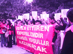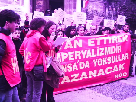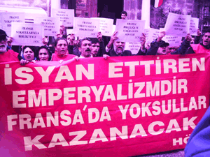 Quelque 75 personnes du Front pour les droits et les libertés (HÖC) se sont ainsi données rendez-vous à l’arrêt de l’antique tram de Taksim où ils déployèrent un calicot sur lequel était inscrit : “C’est l’impérialisme qui pousse à la colère. Les déshérités de France vaincront-HÖC”.