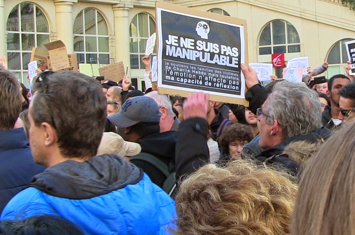 Demain quand tu te réveilleras , que la légitime indignation sera retombée , j’ espère que tu auras l’intelligence de reconnaitre que ceux qui ont tenu bon , qui ont refusé l’ union nationale , qui ont ramé à contre courant pour préparer l’avenir , étaient dans le vrai , avaient fait la bonne analyse , car ce que l’on nous prépare c est une politique autoritaire renforcée sous prétexte de défendre les libertés , et le véritable but de cette politique est de faire accepter l’ austérité , de faire croire qu’il n ya pas d autre issue que cette union nationale pour défendre les "valeurs démocratiques de l europe ", un "tous ensemble" dévoyé pour assurer la survie du capitalisme en crise , un gigantesque enfumage , une énorme supercherie , qui sont à l opposé des valeurs défendues par ceux qui ce sont laissés convaincre de participer à ces manifestations ...