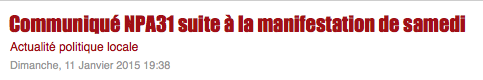 Le NPA 31, co-organisateur de la manifestation en réaction au massacre de Charlie Hebdo, se félicite de la participation massive de la population avec plus de 120 000 personnes dans les rues de Toulouse. Cette manifestation était appelée par un cadre unitaire regroupant des syndicats (CGT, Solidaires, FSU), des partis (PG, Ensemble, NPA,…) et des associations (LDH, Act-Up, FCPE, ATTAC,…). Au dernier moment, le maire de Toulouse (UMP), les représentants du gouvernement PS et leurs alliés (EELV, PCF) ont tenté de récupérer la manifestation et l’émotion populaire, pour nous faire oublier les mauvais coups qu’ils nous préparent avec la loi Macron.