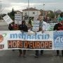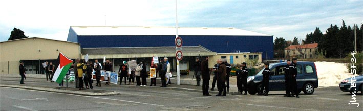 Après avoir distribué le tract dans le centre commercial de la ville et tout le long du parcours aux passants et voitures, nous sommes allés en petite manifestation très animée, coloré et bruyante jusque devant l’entreprise pour dire notre refus de Mehadrin. Installée depuis peu au 696 chemin du Barret de la ZA du Barret à Chateaurenard, Mehadrin a racheté les locaux de l’ancienne entreprise la Bonpasienne qui travaillait aussi dans les fruits et légumes. Une entreprise de très mauvaise réputation selon les voisins, qui a brûlé deux fois... Il semble que les paysans du coin n’appréciaient pas les importations de la Bompasienne. C’est sans doute pour ça que le nom de Mehadrin n’est mentionnée nulle part sur les murs ni même à l’entrée. Visiblement ils jouent dans la discrétion, il ne fait pas bon dire qu’on est une entreprise israélienne d’importation de fruits et légumes après ce qui est arrivé à la Bonpasienne et à Agrexco !