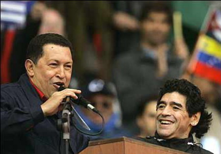 L’allié de Fidel Castro, nouveau sauveur autoproclamé de l’Amérique latine, qui distribue son pétrole à ses voisins en crise et les aide à payer leurs dettes, devait prononcer un discours vendredi dans un stade occupé par le Sommet du peuple, aux côtés d’une autre légende régionale, l’ancien footballeur Diego Maradona.
