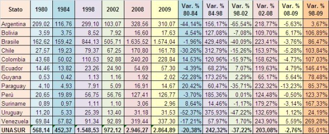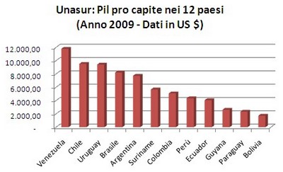 La croissance de ces dernières années a été massive, si vous pensez que seulement en 1996 était la cinquième économie de la région après le Brésil, l’Argentine, la Colombie et le Chili Le tableau suivant indique les données du PIB, le PIB par habitant et la population en 1996 et 2009, en plus des pourcentages de variation respectifs qui se sont produits au cours de la période pour se conformer aux différents états de l’Amérique du Sud, a rencontré aujourd’hui nell’UNASUR.