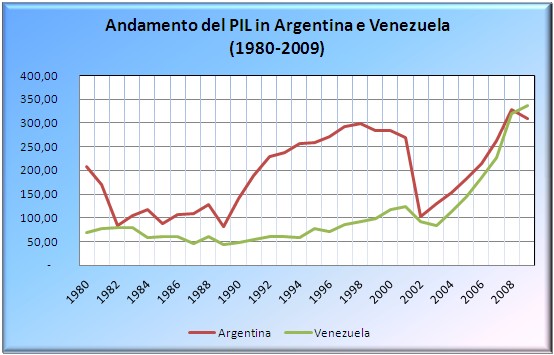 Le tableau suivant illustre le graphique du PIB en Argentine et au Venezuela en ultimi30 ans (1980-2009).