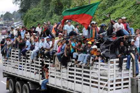 Ce vendredi 21 novembre 2008, les 20.000 marcheurs de la Minga se sont retrouvés sur la place de Bolivar à Bogota, haut lieu de rassemblement des mobilisations sociales en Colombie, à deux pas du palais présidentiel. De nombreuses organisations colombiennes les y accompagnaient. Aîda Quilcue, conseillère majeure du CRIC (Conseil Régional des Indiens du Cauca) a prononcé ces mots.