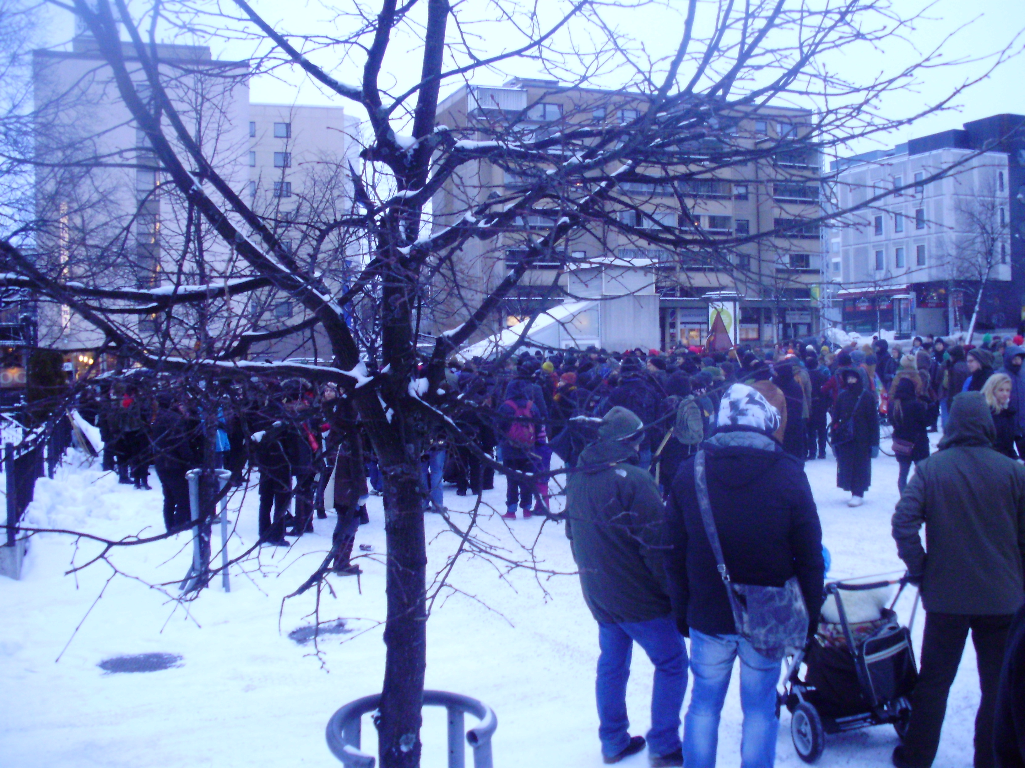 Alors même si se dire anti-fasciste ne rime à rien sans bosser d’arrache-pied à tout ce qui peut changer l’infernale logique qui nous maintient dans ce manichéisme depuis des décennies, même si je le sais très bien, pour une fois, micro-grain de sable, j’étais contente d’en être samedi dernier avec les 200 ou 300 personnes qui avançaient péniblement dans le froid de Tampere en solidarité avec les Grecs, contre racisme et fascisme, dans cette micro-foule où se mélangeaient jeunes socialistes venus d’Helsinki, écolos, communistes, hippies, libertaires, black bloc en puissante et parents à poussette.