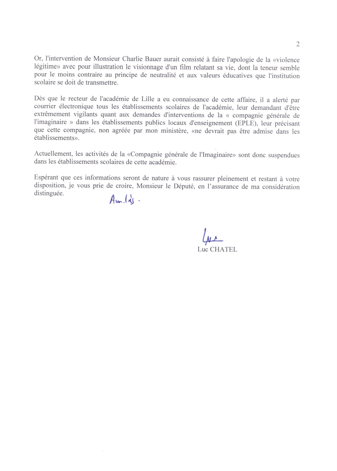 On y apprend qu’il a écrit une lettre au Ministre de l’éducation Luc Chatel...