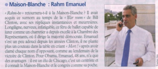 Même choix du silence dans le Nouvel Obs paru le 6 novembre, qui consacre une page aux "quatre hommes clés" d’Obama. L’hebdo est pourtant relativement précis sur Emanuel, racontant comment, au lendemain de la victoire de Clinton, il plantait des couteaux dans la table "en criant « Mort ! » après avoir clamé chaque nom d’opposant."