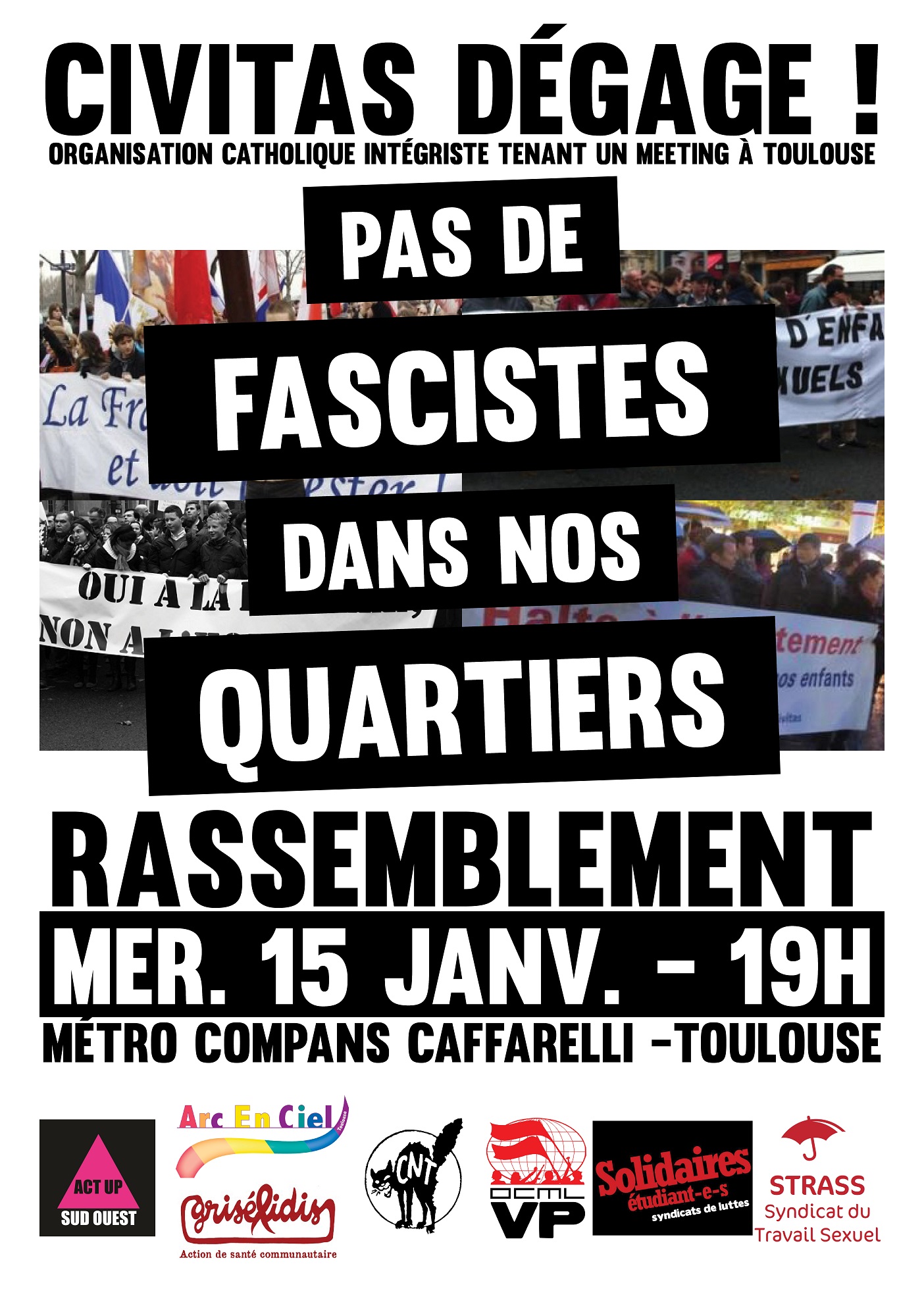 Nous organisations et individuEs de Toulouse appelons à se rassembler le mercredi 15 janvier à 19h Métro Compans Caffarelli pour dénoncer avec force la tenue de ce meeting LGBTIphobe, sexiste et xénophobe dans une salle municipale et les idées réactionnaires qu’il véhicule !