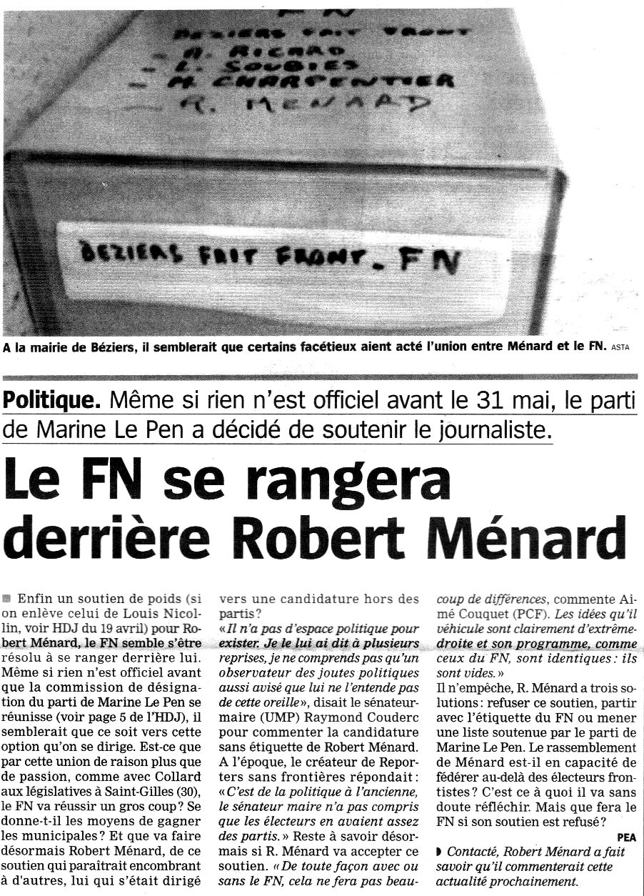 Municipales de Béziers : Robert Ménard se dit "ravi" du soutien du FN (Midi Libre)