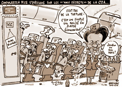 Les pays en question : l’Italie, la Suède, l’Allemagne, l’Espagne, le Royaume-Uni, l’Irlande, probablement la Pologne et la Roumanie. Grâce à ces singes aveugles qui ne voient rien, n’entendent rien et surtout ne disent rien, les Américains ont peu ainsi faire leur sale cuisine, enlevant ici ou là des présumés "terroristes" en Italie ou en Bosnie, les envoyant en Egypte ou en Ouzbékistan, pays où l’on peut torturer à l’aise sans que l’on vous demande des comptes.