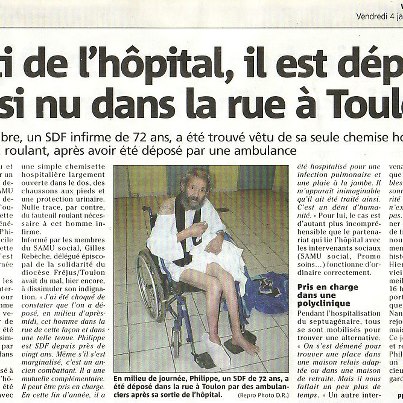 on append dans le journal Var matin qu ’un SDF âgé de 72 ans ,sorti de l’hôpital est déposé quasi nu dans la rue sans son fauteuil roulant, c’était le 31 décembre 2012.