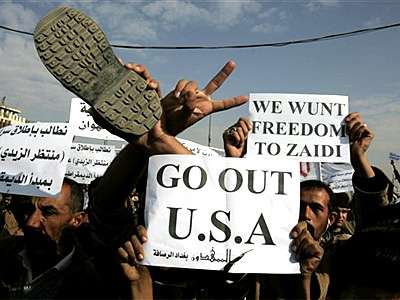 un Irakien risque quelques de prison pour avoir juste jeté une paire de chaussures contre bush qui ose dire que c’était necéssaire se génocide