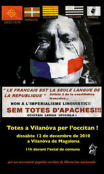 En Bretagne comme en Occitanie, ou en Corse ou ailleurs, si nous laissons passer la décision concernant l’interdiction de la signalétique bilingue à Villeneuve Lès Maguelone, ils vont l’interdire partout. Concernant la référence aux Apaches, je ne vois pas pourquoi on se l’interdirait, c’est pas parce que certains ont utilisé le terme que nous devons nous l’interdire. À ce compte-là, on ne devrait plus utiliser le mot socialisme ou communisme parce que des foireux l’ont repris. Voilà, e visca la lucha de liberacion nacionala per lo socialisme e l’indenpendencia ! Visca la solidaritat internacionala !