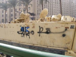 14h00 Nous apprenons que le couvre-feu est avancé à 16h. Il fait un temps magnifique, cela paraît d’autant plus incongru. On nous dit qu’il y a de violents combats de rue dans certains quartiers, que la police n’a pas abandonné la partie, même si elle se tient en retrait là où l’armée s’est déployée. Je remonte Qasr el-Einy. Trois jeunes sur la même moto se retournent vers deux jeunes filles qui marchent sur le trottoir d’en face. L’un deux entonne « al-cha’ab wa el gueysh (le peuple et l’armée) »… puis après un temps d’arrêt, tout sourire « ma’a el-binât (avec les filles) ». Les filles haussent les épaules en souriant. Un char au bout de l’avenue arbore fièrement un « A bas Mubarak ».