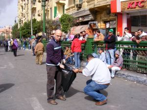 12h30 Je discute avec des jeunes, différents groupes : « êtes-vous sûrs que l’armée va prendre le parti des insurgés, défendre leurs revendications ? » Personne n’en doute : « L’armée égyptienne n’a jamais levé les armes contre le peuple, d’ailleurs l’armée c’est le peuple ». Plus tard en f in d’après-midi, je rencontre un jeune beaucoup plus politisé qui répond ainsi : « Ce n’est pas bien clair.