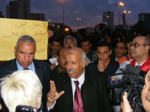 Mustafa Abu Zid, président du tribunal du Caire, sur ce qu’il estime être prioritaire dans les changements à mener : « Il faut commencer par changer la constitution et c’est seulement après que nous pourrons organiser des élections démocratiques », le préalable implicite étant -pour lui comme pour ses collègues- le départ de Mubarak et de sa clique. Un de ses collègues répond à une question de politique étrangère et s’étrangle de colère en évoquant la politique pro-israëlienne de Mubarak. Il s’écarte en s’essuyant les yeux.