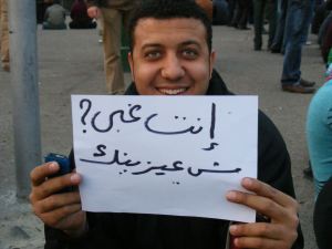 J’avise un groupe de jeunes qui discute avec passion. « On tiendra jusqu’à ce que Mubarak s’en aille ». Ils me racontent ce qui s’est passé au musée qui a visiblement soulevé la colère de nombreux égyptiens. Des policiers en civil sont rentrés pour tout casser et ce sont les manifestants qui ont, avec l’aide de l’armée, empêché le pillage. Ils ont ensuite fait un cordon pour empêcher toute intrusion et l’armée a arrêté la quarantaine de voyous dans les poches desquels on a trouvé des cartes de la « sécurité centrale ». (ce « détail » n’était pas précisé dans les informations de France 24 aujourd’hui). L’un des jeunes du groupe était dans les combats de Qasr el-Einy et il me raconte les horreurs faites par les policiers que personne n’agressait au départ : les tirs à balle réelle, les tabassages parfois avec des matraques hérissées de clous, les arrestations. Plus que tout il me raconte une scène ou un groupe d’insurgés se retrouve prisonnier et conduit en fourgon vers une prison. Pour parfaire l’humiliation, chacun avant de monter dans le camion était frappé à coups de matraque par deux policiers acclamés par les autres. Alors que le premier cortège de la journée se forme derrière nous et entame un tour de place, l’un d’entre eux s’écrit : ils devront tous payer, ce sont des criminels ! Je l’interroge : même les simples policiers ou seulement les officiers ? La discussion qui suit est vive : « chacun est responsable de ses actes, chacun sait ce qui est bien et ce qui est mal ». Un homme d’une quarantaine d’année réagi : « tu as fait l’armée ? Moi quand j’étais là-bas on m’a lessivé le cerveau, je n’étais pas responsable de ce que je faisais ». Un autre ajoute : « un militaire ne peut pas désobéir, sinon c’est lui qui est tué ». Le jeune maintient que chacun est responsable de ses actes, sinon, on ne peut pas vivre en société.
