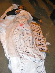 D’autres manifestations symboliques ont eu lieu sur cette place en soirée, comme ce jeune qui dédie son geste aux « martyrs » qui sont tombés depuis le début des événements. La pancarte dit quelque chose comme « Ô Mubarak, ô l’ignoble, le sang des égyptiens n’est pas à vendre », faisant allusion à l’appétit financier du président en exercice.