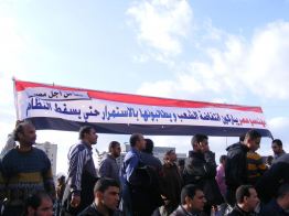 Des gens de classe moyenne voire aisée se sont aventurés, au moins dans le temps précédant le couvre-feu, pour venir apporter leur soutien au mouvement.Des corporations sont aussi venues rejoindre les insurgés comme celle des ingénieurs qui arborait ici une fière banderole : « Les ingénieurs d’Egypte se félicitent de l’intifada du peuple et lui demandent de poursuivre jusqu’à la chute du régime ».