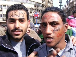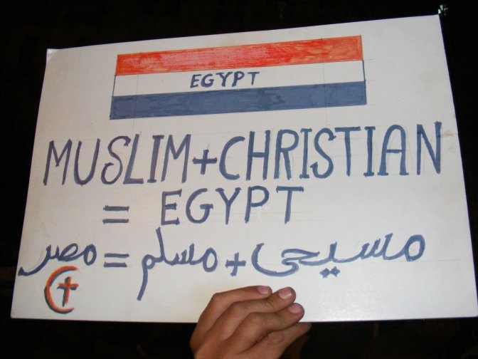 qu’une gigantesque banderole tendue en travers de la place, réclame en anglais. L’unité du peuple égyptien est déclinée sur tous les tons : « il n’y a pas de fitna entre musulmans et chrétiens mais entre le peuple et le régime ». J’apprends que la veille, musulmans et chrétiens ont organisé une prière commune sur la place.